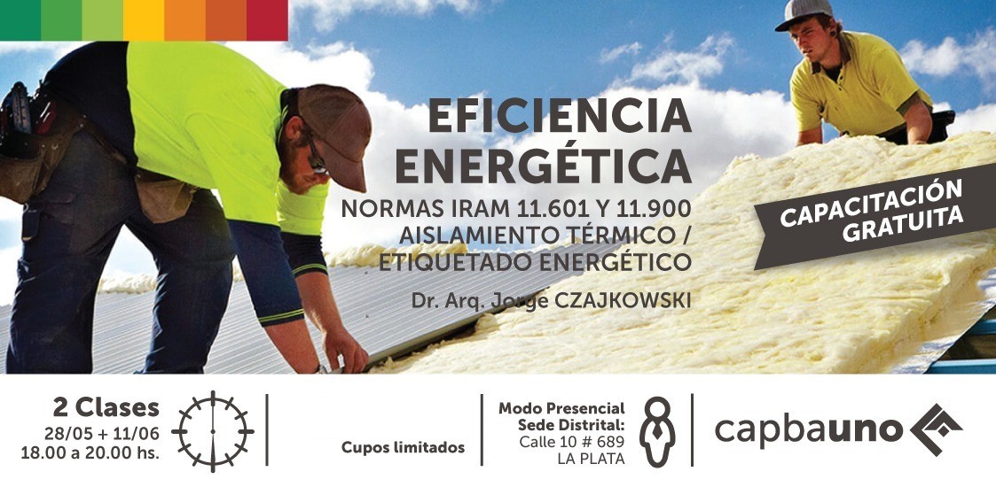 En el Colegio de Arquitectos de la Provincia de Buenos Aires Distrito Uno (CAPBAUNO) se desarrollarán dos jornadas de capacitación los días 28 de mayo y 11 de junio a las 18 hs en la Sede Distrital, sobre eficiencia energética.