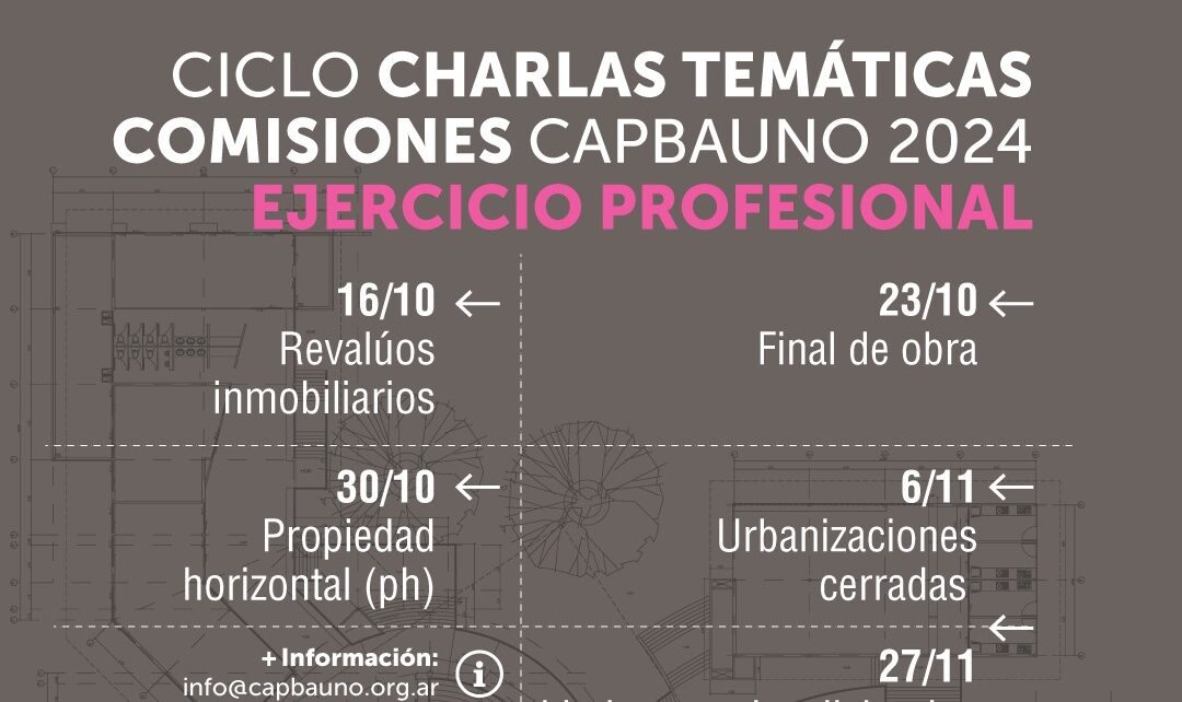 La Comisión de Ejercicio Profesional está desarrollando los miércoles un ciclo de charlas enfocadas en aspectos conceptuales y herramientas básicas para la actuación profesional en: Revalúos inmobiliarios; Final de obra (23/10); Propiedad horizontal (PH) (30/10); Urbanizaciones cerradas (6/11)y Linderos y ejes divisorios (27/11).