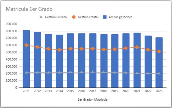 La tendencia de disminución de alumnos en primer grado es similar. El último relevamiento anual muestra que, en comparación con 2011, en 2023 ingresaron 102.000 alumnos menos a la primaria, lo que representa una disminución del 12,6% en la matrícula general. El fenómeno se refleja principalmente en el sector estatal, cuya caída es del 15%. En cambio, en las escuelas privadas, la reducción es del 6%.