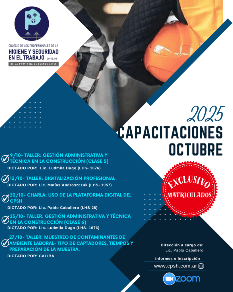 Durante el mes de octubre el Colegio de Profesionales de la Higiene y Seguridad en el Trabajo de la Provincia de Buenos Aires continua con las acciones de formación exclusiva para sus matriculados.
