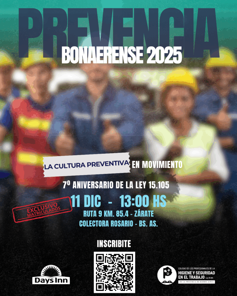 El próximo 11 de diciembre, como cierre de año, el Colegio de Profesionales de la Higiene y Seguridad en el Trabajo de la Provincia de Buenos Aires se llevará a cabo el 13º Encuentro Provincial de Higiene y Seguridad y el 1º PREVENCIA PBA -INTERNACIONAL.