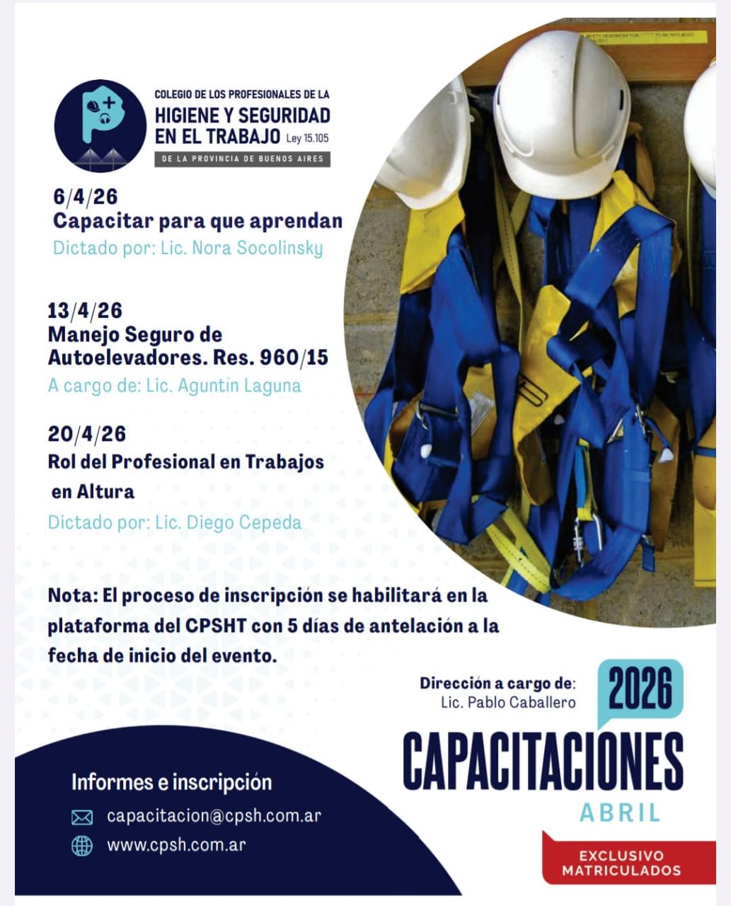 El Colegio de los Profesionales de la Higiene y Seguridad en el Trabajo de la Provincia de Buenos Aires dio a conocer el cronograma de capacitaciones para abril, destinadas exclusivamente a los profesionales matriculados: