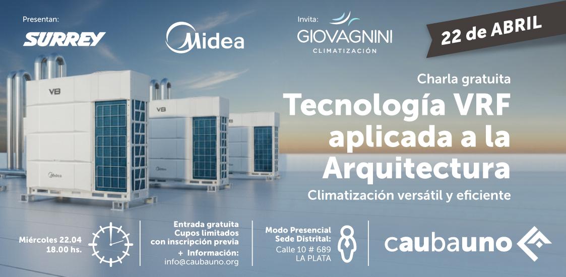 El miércoles 22 de abril a las 18 hs en la Sede Distrital del Colegio de Arquitectura y Urbanismo de Provincia de Buenos Aires Distrito Uno (CAUBAUNO), por invitación de la firma Giovagnini climatización, se desarrollará una capacitación sobre tecnología VRF (Volumen de Refrigerante Variable) de Surrey/Midea, aplicada a las obras de arquitectura contemporánea.