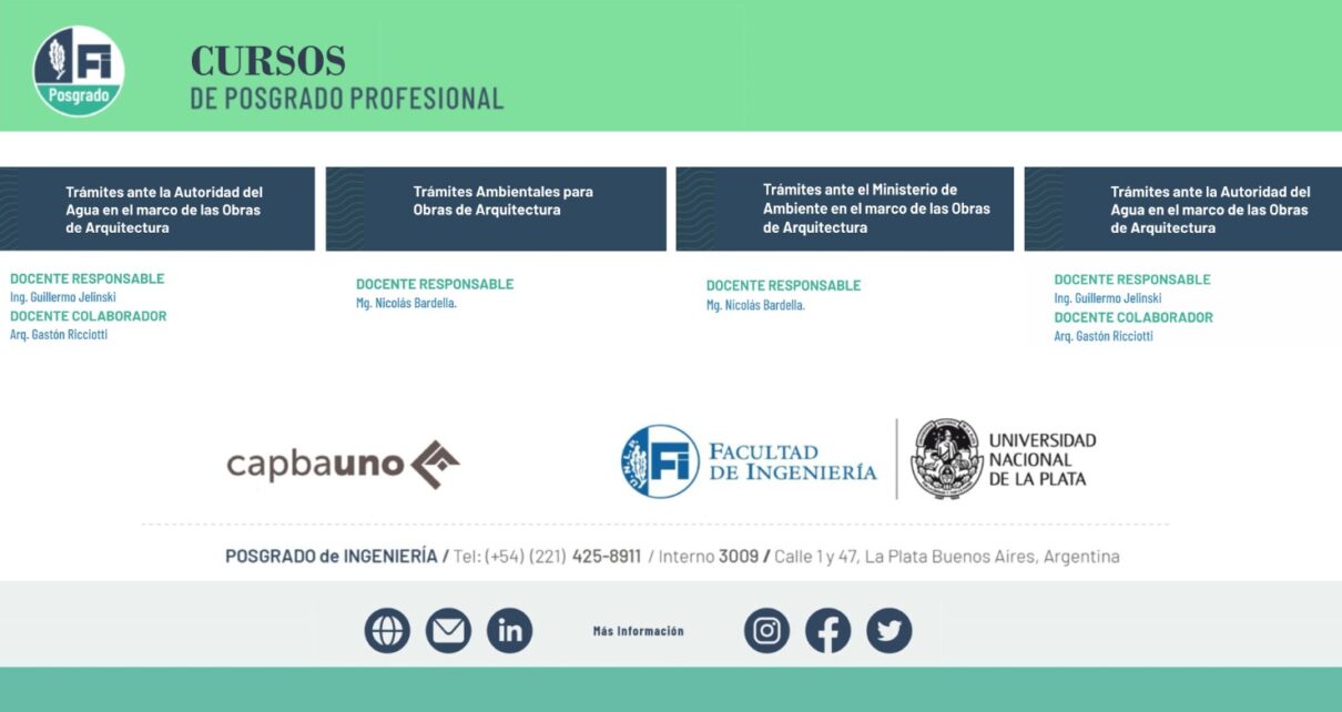 A través del convenio firmado con la Facultad de Ingeniería de la Universidad Nacional de La Plata, los arquitectos matriculados del Colegio de Arquitectos de la Provincia de Buenos Aires Distrito Uno (CAPBAUNO) cuentan con facilidades y aranceles diferenciales para acceder a capacitaciones de posgrado dictadas por la misma. Ya está abierta la inscripción para un […]